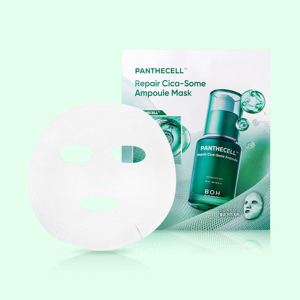 BIOHEAL BOH Panthecell Repair Cica-some Ampoule Mask is an ampoule-soaked sheet mask designed to calm stressed, sensitive-feeling skin and support barrier recovery in one use. Powered by Cica-some™ (encapsulated cica soothing care) and panthenol, it helps reduce the look of redness and irritation, relieve dryness tightness, and leave skin feeling comfortable and hydrated. The essence absorbs with a fresh, non-sticky finish—perfect after sun exposure, exfoliation, or whenever skin feels reactive.