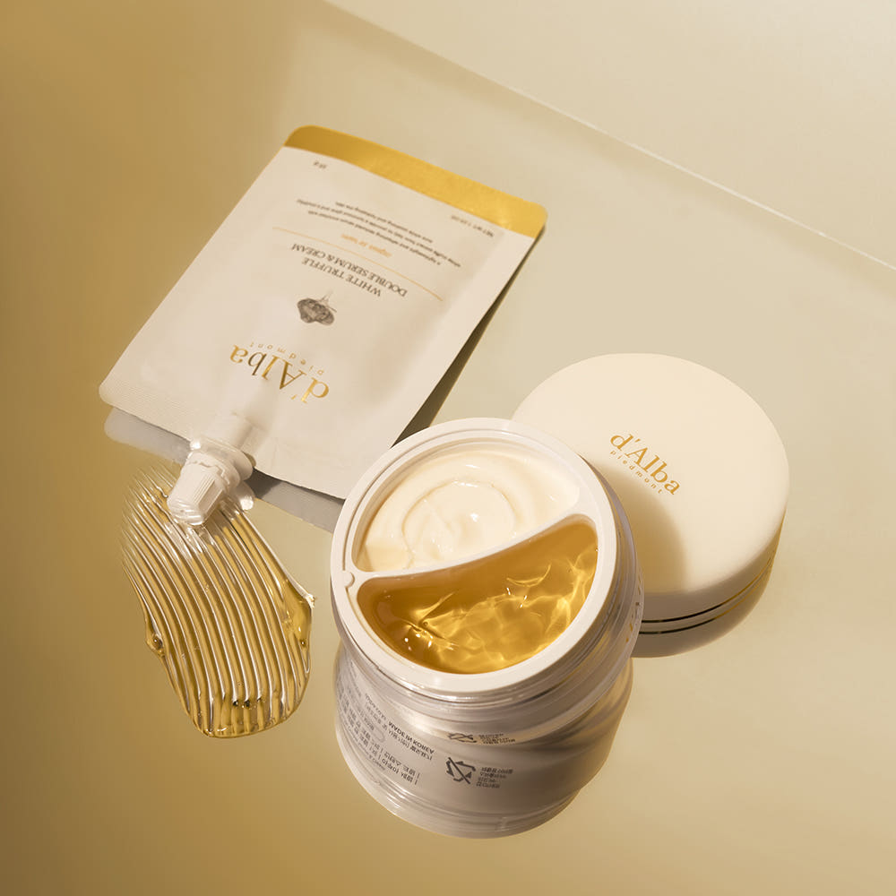 This double serum and cream is designed to deliver customized skin care by combining two textures in one jar. The serum layer provides lightweight hydration and quick absorption, while the cream layer delivers rich nourishment and moisture retention. Infused with white truffle extract, this dual-formula moisturizer helps improve skin softness, balance hydration levels, and support a healthy, radiant complexion without feeling heavy.